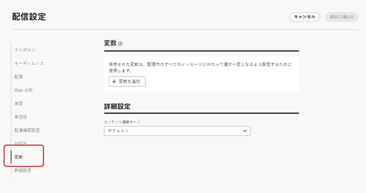 配信に変数を追加できます。これは、トラッキングやパーソナライゼーションに役立ちます。これらの変数には、配信コンテンツとワークフローの両方からアクセスできます。保存された変数は、配信内のすべてのメッセージにわたって値が一定となるよう設定するために使用します。また、配信テンプレートで設定することもできます。