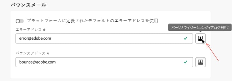 エラーアドレス:「プラットフォームに定義されたデフォルトのエラーアドレスを使用」切替スイッチをアクティブ化する場合は、バウンスメールがプラットフォームのデフォルトエラーボックスに受信されます。アクティブ化しない場合は、配信用の専用エラーアドレスを定義できます。