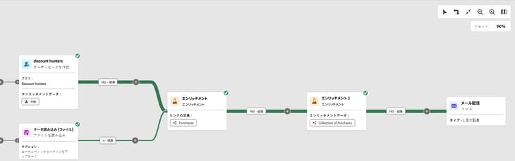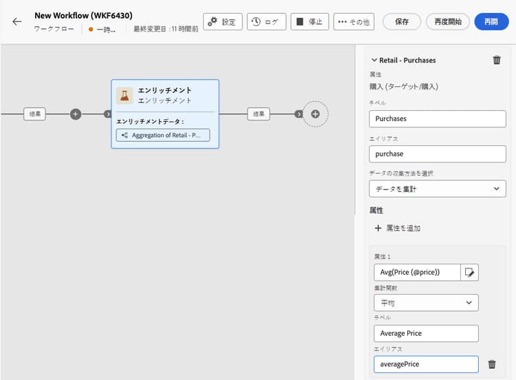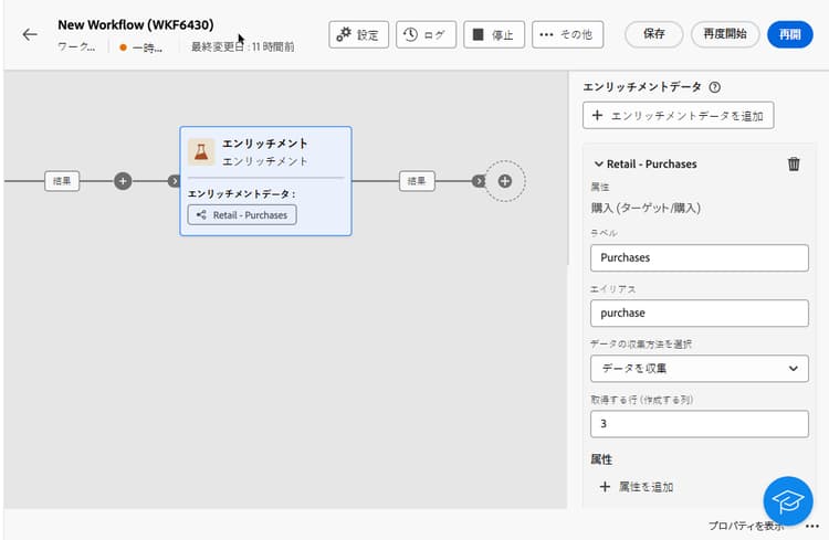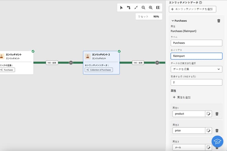 2 番目の「エンリッチメント」アクティビティは、「ファイルを読み込み」アクティビティからの購入データを使用してワークフローテーブルのデータをエンリッチメントするために追加されます。これにより、これらのデータを追加のアクティビティに使用でき、例えば、購入に関する情報をお客様に送信するメッセージをパーソナライズできます。