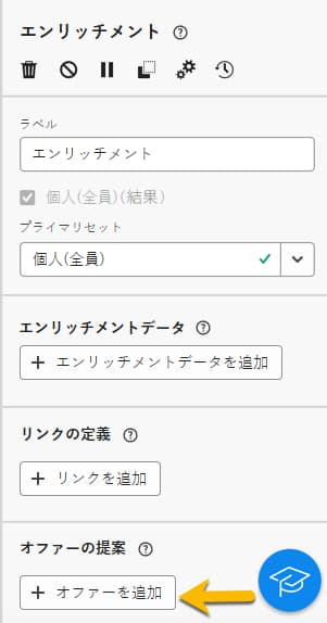 エンリッチメント アクティビティの「オファーの提案」セクションで、「オファーを追加」ボタンをクリックします。