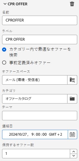 カテゴリ内で最適なオファーを検索:このオプションをオンにする場合は、オファーエンジン呼び出しのパラメーター(オファースペース、カテゴリまたはテーマ、連絡日、保持するオファーの数)を指定します。エンジンは、これらのパラメーターに従って、追加する最適なオファーを計算します。「カテゴリ」フィールドと「テーマ」フィールドは、両方同時には使用せず、どちらか一方のみ入力することをお勧めします。