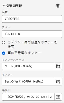 事前定義済みオファー:このオプションをオンにして、オファースペース、特定のオファーおよび連絡日を指定し、オファーエンジンを呼び出すことなく、追加するオファーを直接設定します。