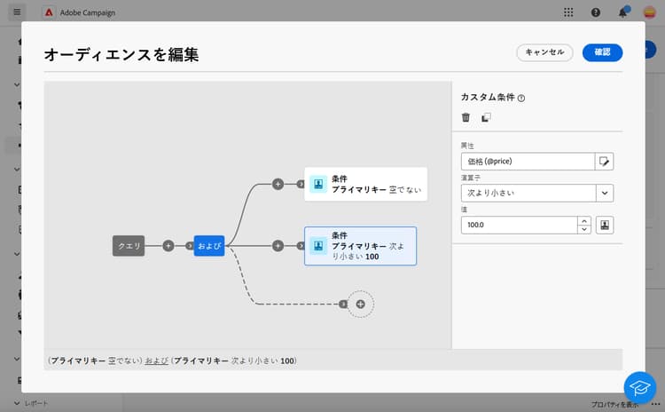 ここでは、エンリッチメント属性の最大値を定義します。100 を超える項目は除外します。詳しくは、クエリモデラーの操作方法を参照してください