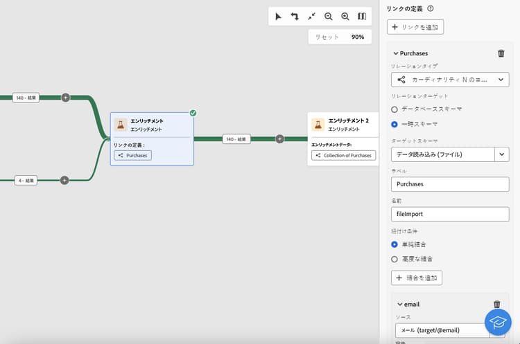 最初の「エンリッチメント」アクティビティでは、プライマリセット(「クエリ」アクティビティのデータ)を「ファイルを読み込み」アクティビティのスキーマにリンクします。これにより、クエリのターゲットになる各プロファイルを、対応する購入データと一致させられるようになります。