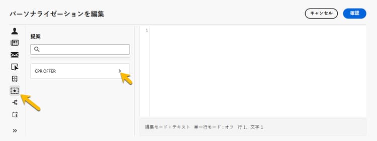 E メールデザイナーで、オファーを含むパーソナライゼーションを追加する際に、「提案」アイコンをクリックすると、エンリッチメント アクティビティから取得したオファーが表示されます。選択するオファーをクリックして開きます。