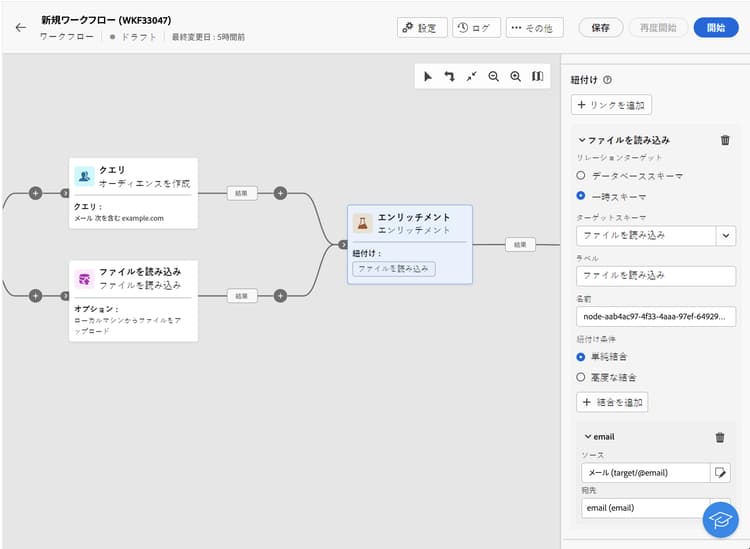 以下の例は、Adobe Campaign データベースの受信者テーブルと、ファイルを読み込み アクティビティを生成した一時テーブルの間にリンクを作成するように設定されたワークフローを示しています。この例では、エンリッチメントアクティビティが、メールアドレスを紐付け条件として使用して両方のテーブルを紐付けします。