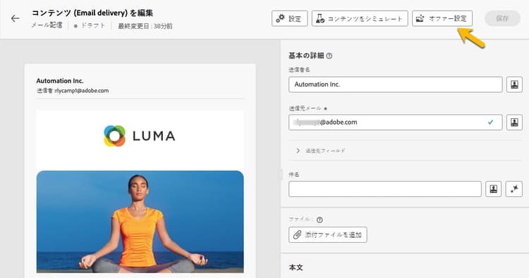 配信アクティビティを開き、コンテンツ編集に移動します。「オファー設定」ボタンをクリックし、ドロップダウンリストでオファーに対応する オファースペース を選択します。