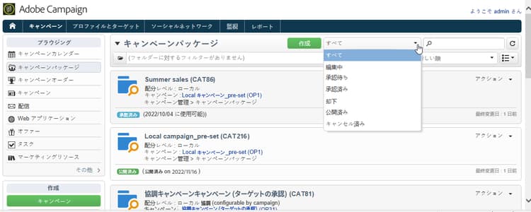 「キャンペーン」タブから、既存のすべての分散型マーケティングキャンペーンを再グループ化した キャンペーンパッケージ リストを表示できます。このリストをフィルタリングして、公開済み、遅延、承認待ちなどの状態にあるキャンペーンのみを表示できます。それには、このビューの上部にあるリンクをクリックするか、フィルターリスト リンクを使用して、表示するキャンペーンパッケージのステータスを選択します。