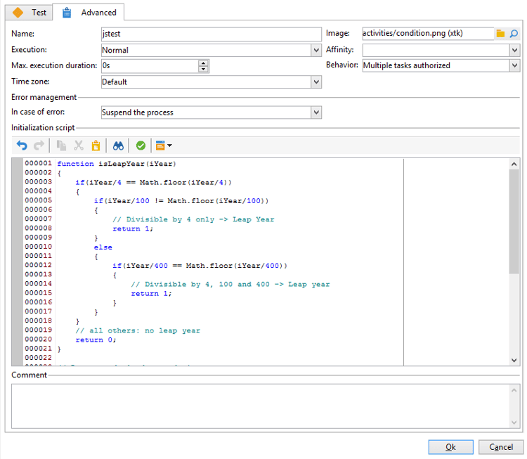 「テスト」アクティビティでは、今年が閏年であるかどうか、また現在の日付が 3 月 1 日であるかどうかの確認ができます。