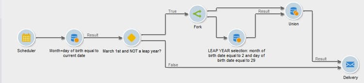 テストの結果、今年が閏年ではなくて 2 月 29 日は存在せず、さらに現在の日付が 3 月 1 日である場合、「TRUE」トランザクションが有効になり、2 月 29 日生まれの受信者が 3 月 1 日の配信に追加されます。そうでない場合は、「False」トランザクションが有効になり、3 月 1 日生まれの受信者だけが配信を受け取ります。