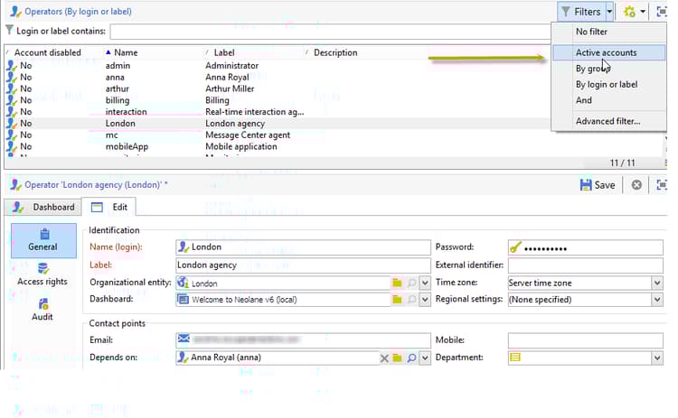 例えば、オペレーターのリストを「アクティブなアカウント」でフィルターできます。