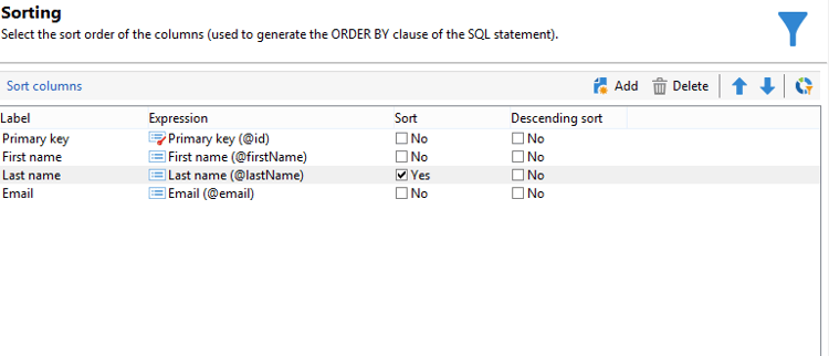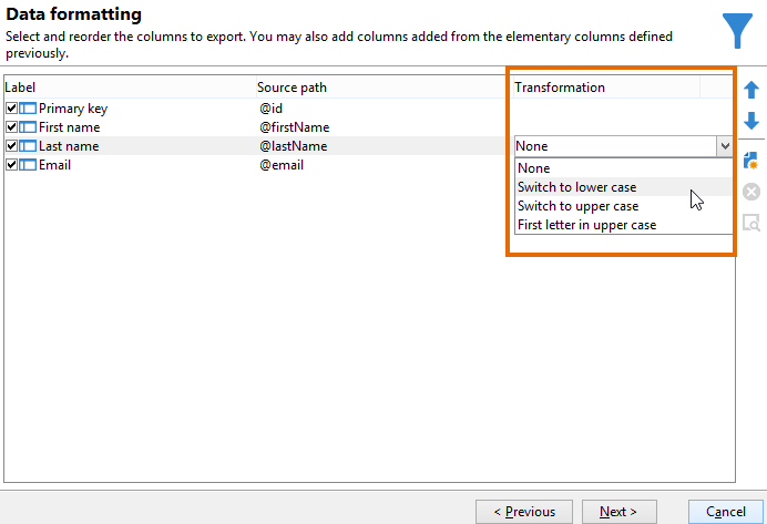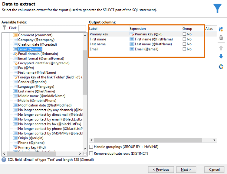 抽出するデータ ウィンドウで、「プライマリキー」、「名」、「姓」および「メール」を選択します。