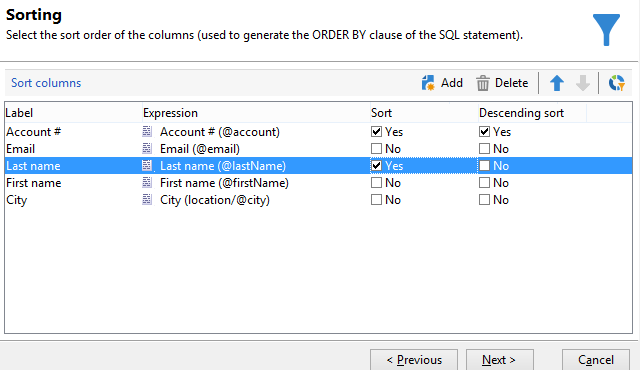 列を並べ替えて適切な順序で表示します。ここでは、アカウント番号を降順、名前をアルファベット順に並べ替えます。「次へ」をクリックします。