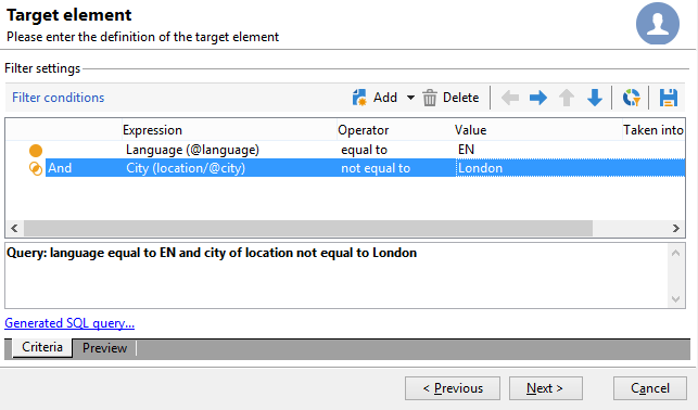 ターゲット要素 ウィンドウで、フィルター設定を入力できます。