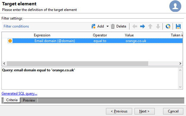 ウィンドウの下部に、メールドメインが「orange.co.uk」に等しい というクエリの概要が表示されます。