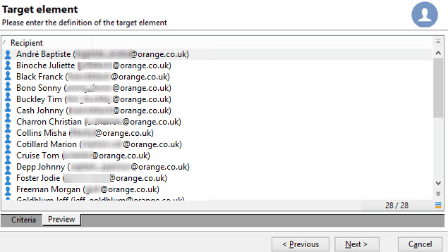 「プレビュー」をクリックしてクエリ結果を確認します。メールドメインが「orange.co.jp」のデータのみが表示されます。
