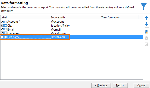 これにより、データフォーマット ウィンドウが表示されます。列の順序を確認します。「市区町村」列を「アカウント番号」列の下に移動します。