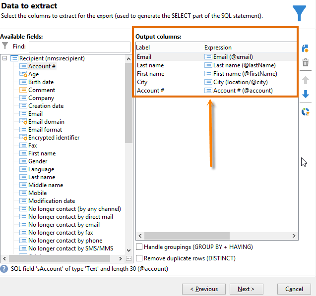 「姓」、「名」、「メール」、「市区町村」および「アカウント番号」を選択します。これらのフィールドは、「出力列」に追加されます。「次へ」をクリックします。