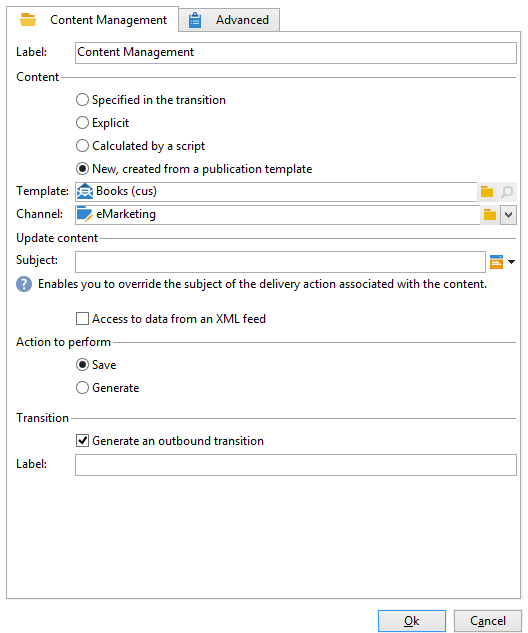 「コンテンツ管理」アクティビティでは、コンテンツの作成と操作、およびこのコンテンツに基づくファイルの生成をおこなうことができます。その後、このコンテンツを「配信」アクティビティ経由で配信できます。