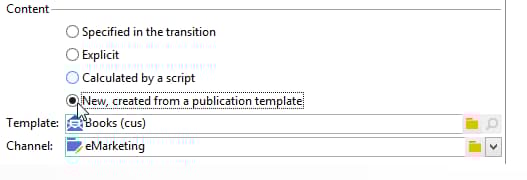 パブリッシュテンプレートを使用して、新しいコンテンツを作成します。「文字列」フィールドで指定されたファイルに新しいコンテンツが格納されます。「テンプレート」フィールドで、コンテンツの作成に使用されるパブリッシュテンプレートを指定します。