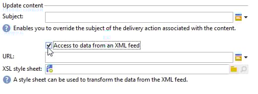 XSL スタイルシート経由でダウンロードした XML ドキュメントからコンテンツを構築できます。このオプションが選択されている場合、「URL」フィールドは XML コンテンツのダウンロード URL を指定します。「XSL スタイルシート」では、ダウンロードした XML ドキュメントの変換に使用されるスタイルシートを指定できます。このプロパティはオプションです。