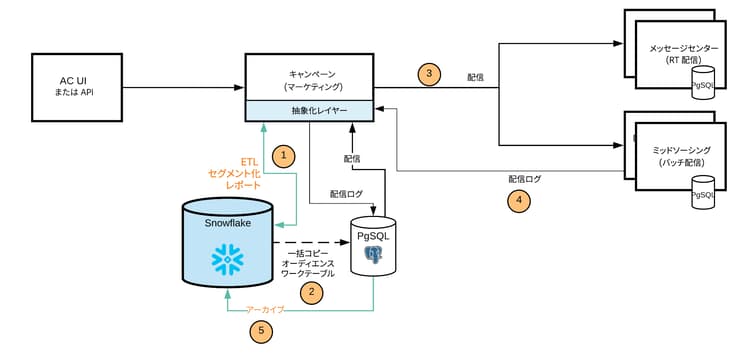 Snowflake にテーブルを作成し、Adobe Campaign にリンクさせることができます。例えば、保存期間中にアーカイブされたデータを使用したり、優れたパフォーマンスでセグメント化プロセスを実行したりすることができます。また、このアーキテクチャを使用すると、Snowflake でデータ管理ワークフロー機能を使用することができます。パーソナライゼーションおよび配信の目的で、集計および一時テーブルのみが Campaign に移動されます。