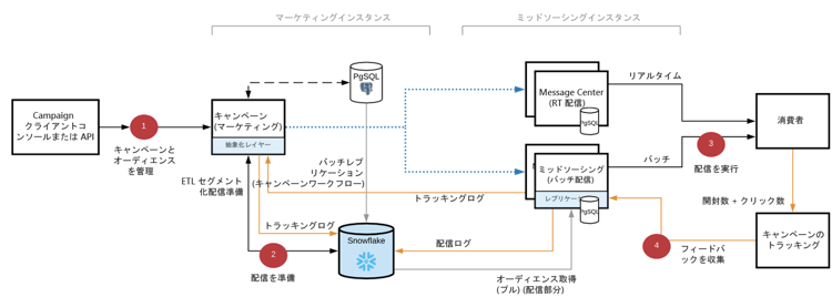 - 配信ログ、トラッキングログ、プッシュ登録など、Campaign で生成または収集されたすべてのイベントと行動データの保存。