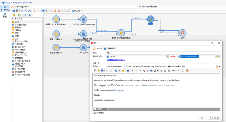 重複したキーが検出された場合、特定の通知が ワークフロースーパーバイザー オペレーターグループに送信されます。このアラートのコンテンツとオーディエンスは、単一性アラート ワークフローの アラート アクティビティで変更できます。
