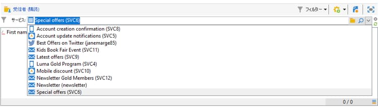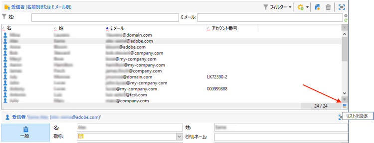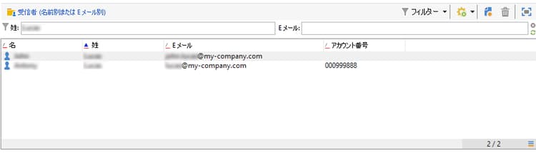 各リストの上のフィールドでは、このリストに デフォルトの定義済みフィルター を使用できます。受信者リストの場合、デフォルトで名前とメールアドレスでフィルターできます。