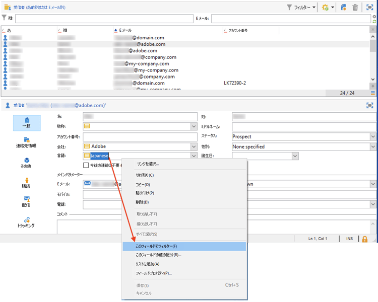 %@gmail.com」と入力します。姓に「L」が含まれるすべてのプロファイルを表示するには、「姓」フィールドに「%@L」と入力します。受信者リストのデフォルトのフィルターを変更するには、プロファイルとターゲット/定義済みフィルター ノードを参照します。