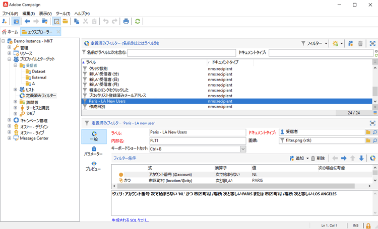 フィルターの詳細には、エクスプローラーの プロファイルとターゲット/定義済みフィルター ノードでアクセスできます。