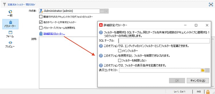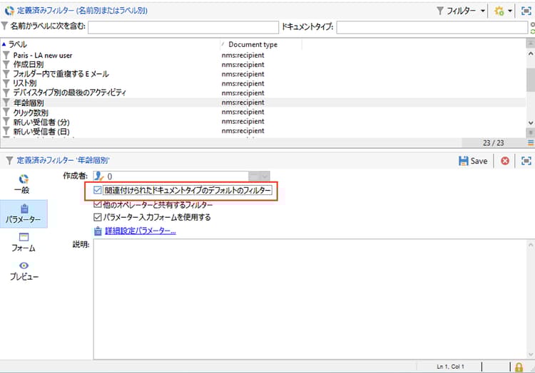 「パラメーター」タブをクリックし、「関連付けられたドキュメントタイプのデフォルトのフィルター」を選択します。