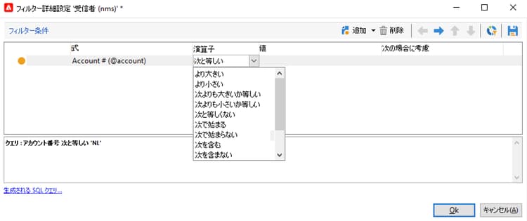 期待される値を「値」列から選択します。複数のフィルターを組み合わせてクエリを絞り込むことができます。フィルター条件を追加するには、「追加」をクリックします。