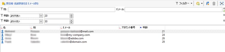 受信者リストで「年齢」列を右クリックし、「この列でフィルター」を選択します。