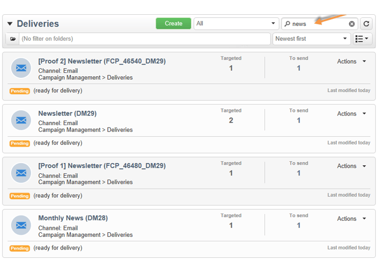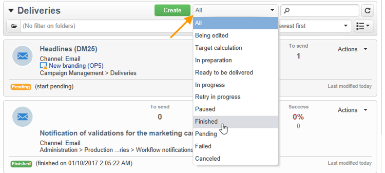 例えば配信の場合は、次に示すように、完了した配信のみを表示するように選択できます。