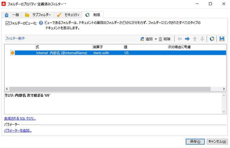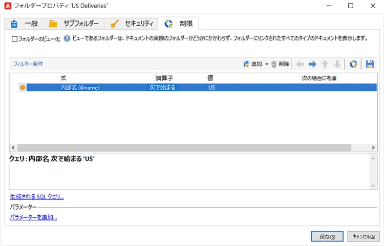 フォルダーに格納されているデータをフィルターするには、フォルダーのプロパティにアクセスし、「制限」タブを選択します。