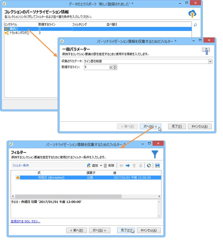 要素のコレクション(受信者の購読、受信者が属するリストなど)をエクスポートする場合は、エクスポートするコレクション内の要素数を指定する必要があります。