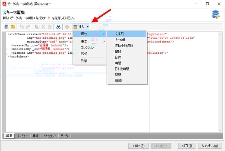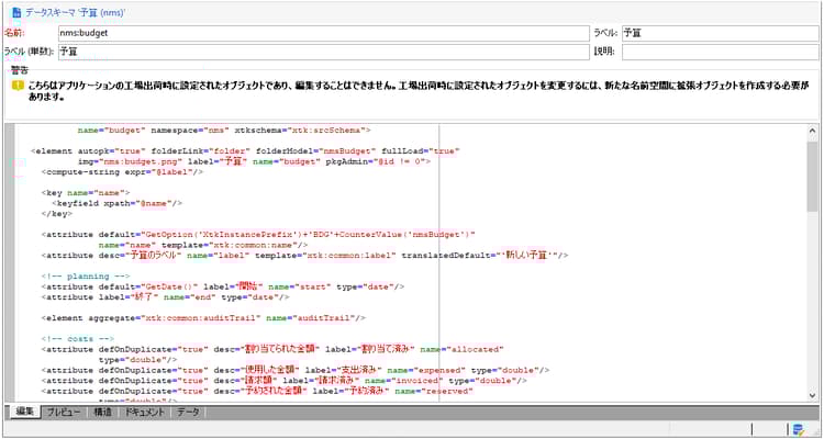 「編集」タブには、スキーマの XML コンテンツが表示されます。