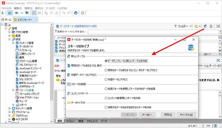 Adobe Campaign ツリーの 管理/設定/データスキーマ ノードを編集し、「新規」をクリックします。