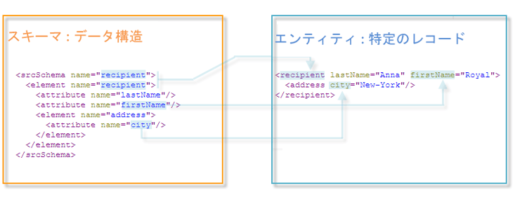 スキーマは、データベーステーブルに関連付けられた XML ドキュメントです。この中でデータ構造を定義し、表の SQL 定義を記述します。