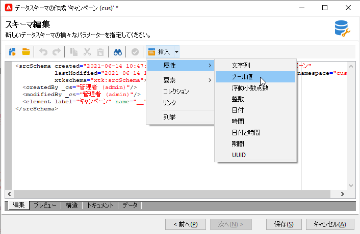 属性を使用すると、データオブジェクトを構成するフィールドを定義できます。スキーマエディションのツールバーの「挿入」ボタンを使用すると、カーソルのある XML に空の属性テンプレートをドロップできます。詳細については、この節を参照してください。