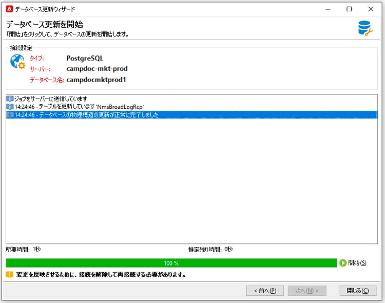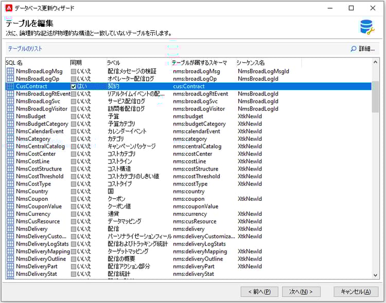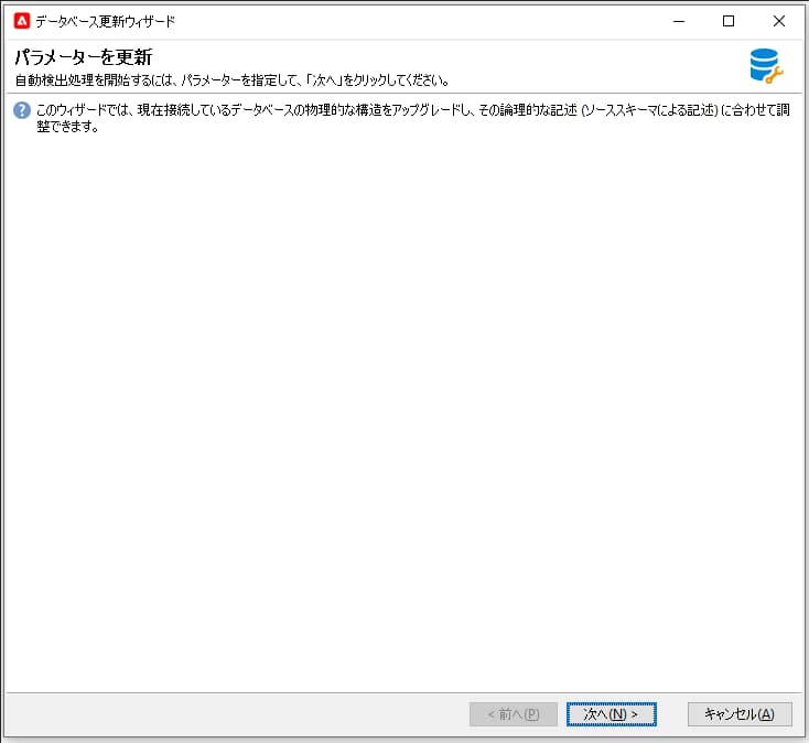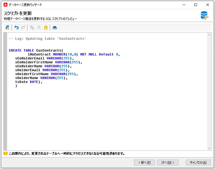 スキーマに加えた変更を適用するには、データベース更新ウィザードを起動します。この機能は、ツール/詳細/データベース構造を更新から利用できます。 データベースの物理構造が論理的な記述と一致するかどうかを確認し、SQL 更新スクリプトを実行します。