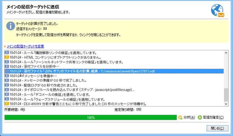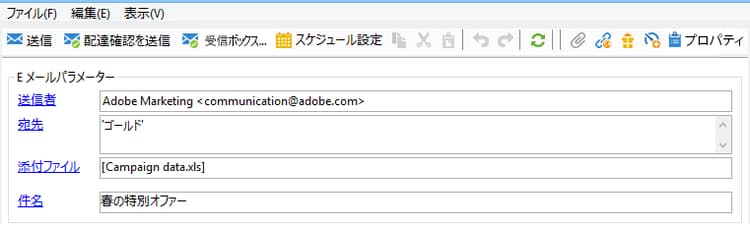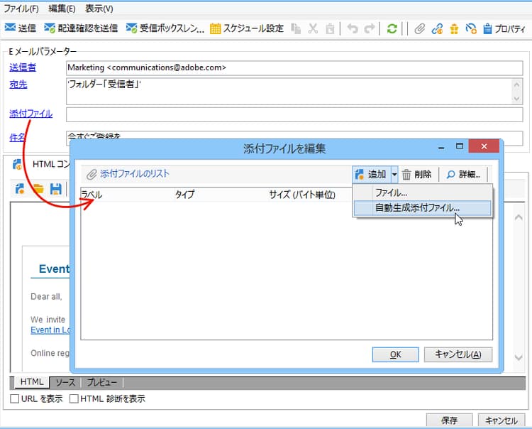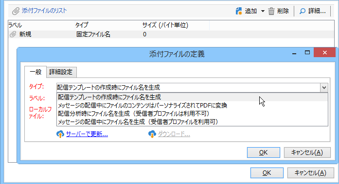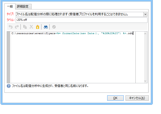 配信の準備中に添付ファイルの名前を計算できます。これをおこなうには、「配信分析時にファイル名を生成(受信者プロファイルは利用不可)」オプションを選択します。