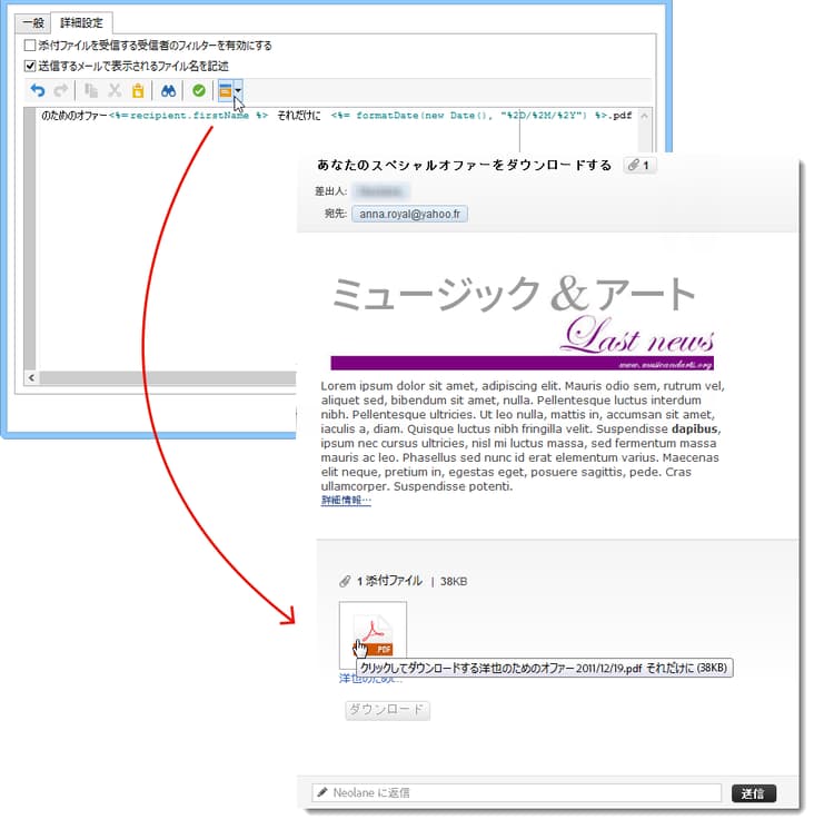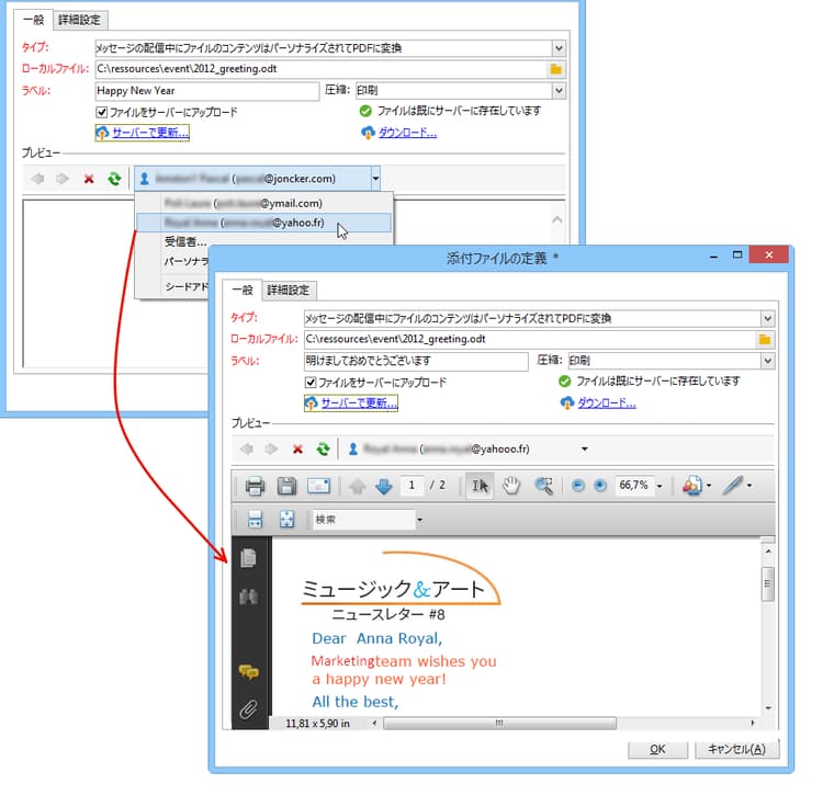 - 添付ファイルのコンテンツを受信者ごとにパーソナライズする。この場合、計算済み添付ファイル を作成する必要があります。添付ファイルの名前は、各メッセージの送信時に、受信者に応じて自動生成されます。また、Variable Digital Printing オプションがインストールされている場合は、コンテンツをパーソナライズし、配信時に PDF 形式に変換して添付することもできます。