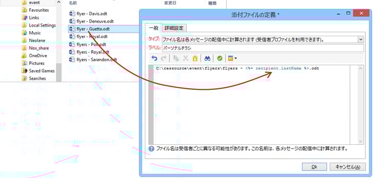 下の例では、結合フィールドを使用して定義されたファイル名に基づいて添付ファイルを選択しています。