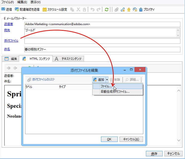 ローカルファイルを配信に添付するには、以下の手順に従います。