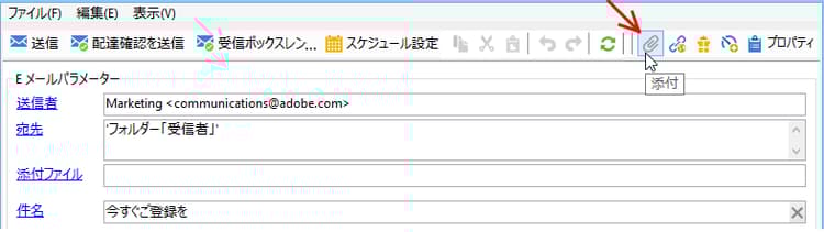 また、配信の「添付ファイル」フィールドにファイルを直接ドラッグ&ドロップしたり、配信アシスタントのツールバーから 添付 アイコンを使用したりできます。