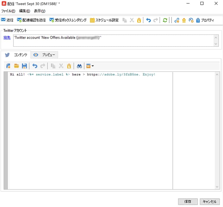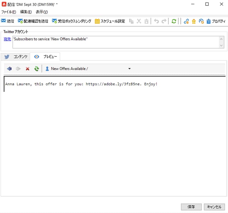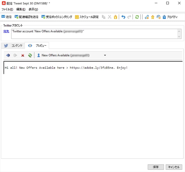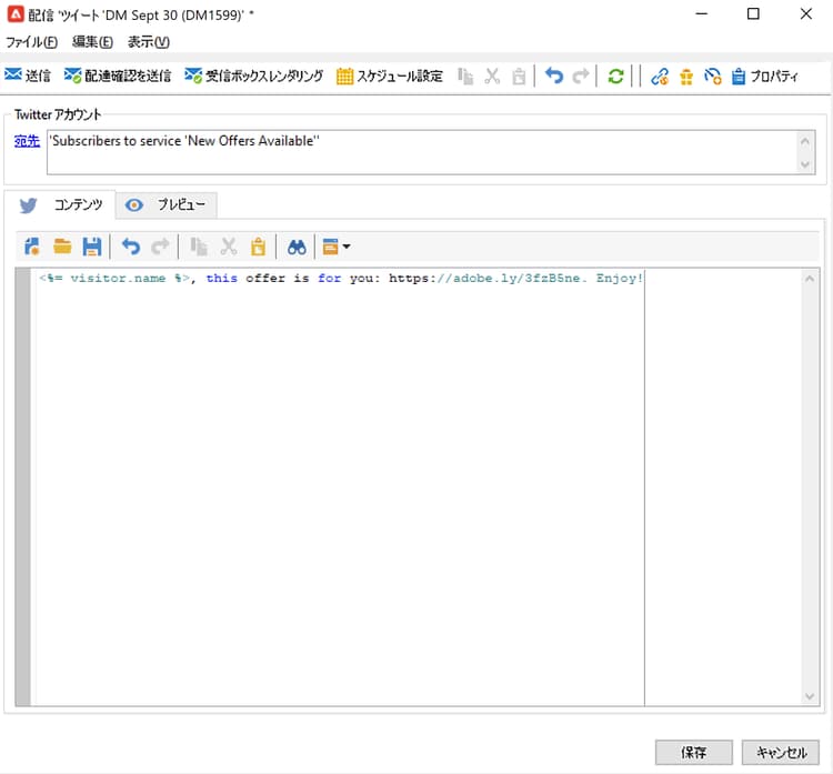 「ツイート(ダイレクトメッセージ)」ビルトインの配信テンプレートに基づいて X 配信を作成します。