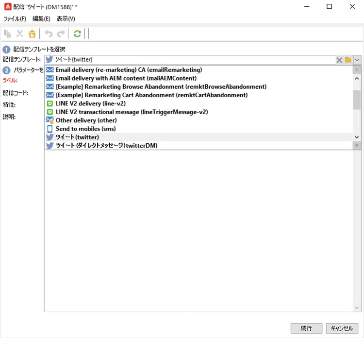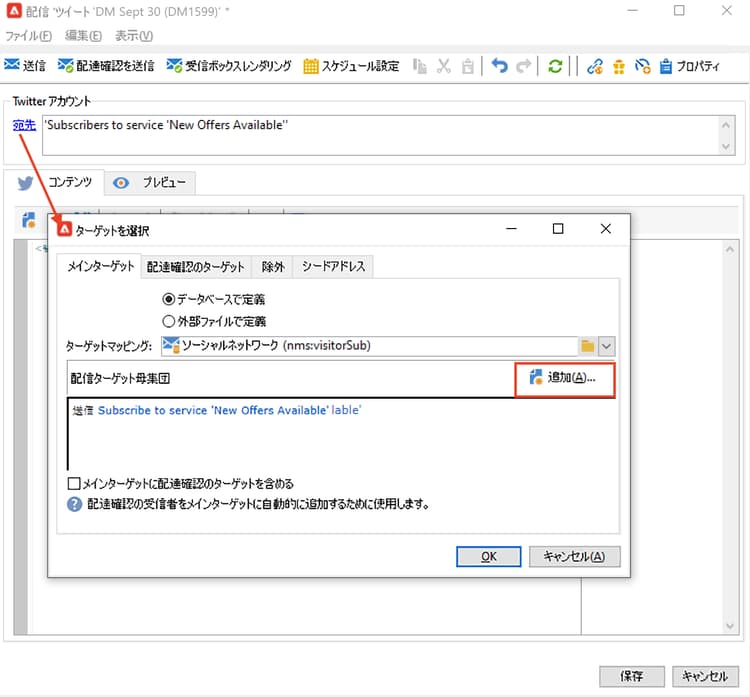 note note NOTE すべての配信に同じ X テストアカウントを使用する場合、「ツイート」配信テンプレートに配達確認のターゲットを保存できます。このテンプレートには、リソース/テンプレート/配信テンプレートノードからアクセスできます。これにより、新規の各配信で、配達確認のターゲットがデフォルトで入力されるようになります。 -