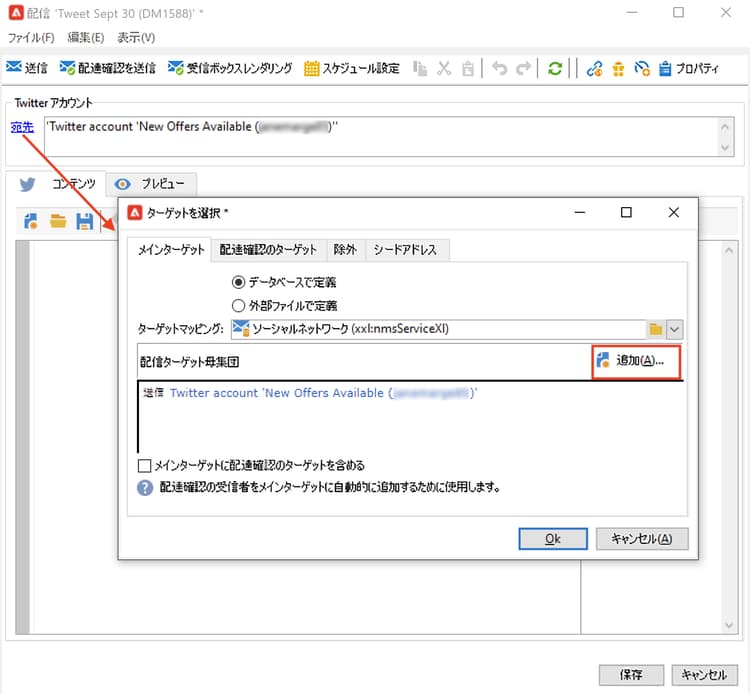 「配達確認のターゲット」タブでは、最終的な配信の前に、テスト配信目的で使用する X アカウントを定義できます。